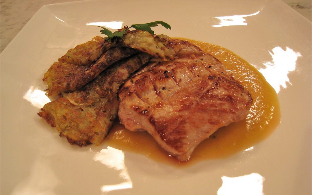 Para la salsa de cerveza picar una cebolleta y comenzar a rehogarla con dos dientes de ajo. Agregar la cerveza, la mostaza, la miel y unas gotas de zumo de limón. Salpimentar y dejar reducir a fuego medio. Para el rostí, debemos pelar, lavar y secar las patatas. Rallarlas sobre un bol y escurrir un poco para que pierdan el exceso de agua. Salpimentar y agregar un poco de romero seco. Disponer una sartén antiadherente al fuego, con un poco de aceite. Extender las patatas ralladas encima y comenzar a cocinar a fuego muy suave; dándole forma de tortilla. Cocinar unos 20 minutos por cada lado, hasta que nos quede bien crujiente. Verter un vaso de caldo de carne en la salsa y continuamos reduciéndola al fuego. Limpiar el solomillo y cortarlo por la mitad. Abrir cada mitad en forma de libro, hacer unos pequeños cortes superficiales y comenzar a dorar a fuego fuerte con un poco de virgen extra. Cuando le demos la vuelta a la carne será cuando la salpimentemos. Disponer la salsa en una jarra, triturarla bien y devolverla al fuego para que hierva de nuevo.