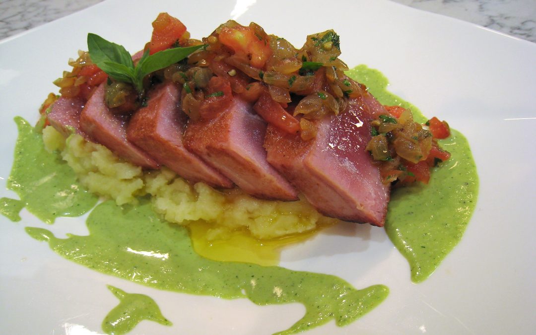 Pelar las patatas, trocearlas y disponerlas en agua hirviendo con sal hasta que estén cocidas. Mientras tanto, picar las cebollas en daditos y comenzar a sofreírlos en una sartén con unas cucharadas de virgen extra, a fuego medio, hasta que esté bien pochada. Por otro lado, para el pesto, disponer en una jarra 1 manojo de hojas de albahaca, 1 diente de ajo, las almendras fritas, sal y pimienta. Añadir 1/2 vaso de aceite de oliva virgen extra y triturar bien. Verter en un cuenco, añadir el queso rallado, mezclar y reservar. Escurrir las patatas y aplastarlas con las púas de un tenedor. Salpimentar, añadir un poco de virgen extra, mezclar bien y reservar. Por otro lado, apartar la cebolla pochada en un cuenco y agregar los tomates pelados, sin semillas y cortados en pequeños dados, perejil picado, sal y un poco de virgen extra. Finalmente, cortar el atún en porciones y cocinarlas en una sartén con unas cucharadas de aceite de oliva virgen extra.