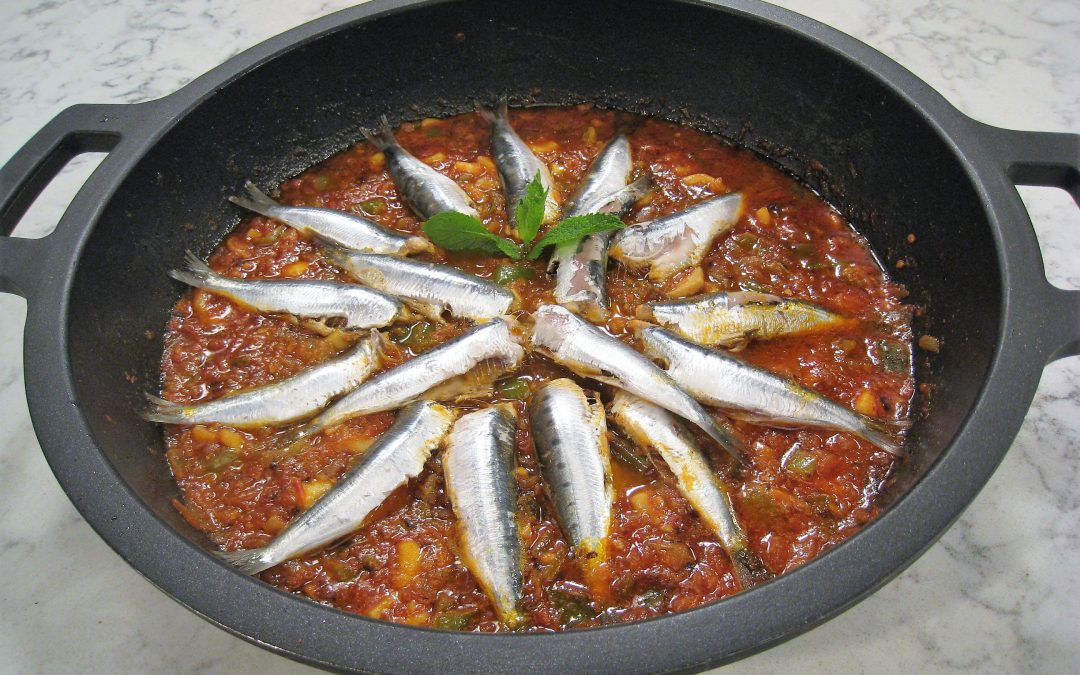 Para la moraga comenzaremos a sofreír en una cacerola con unas cucharadas de virgen extra la cebolla, los pimientos verdes y los dientes de ajo; todo picado con el cuchillo. Dejamos sofreír unos minutos e incorporamos el calamar troceado en dados. Agregar entonces las hebras de azafrán, 1 hoja de laurel y 2 clavos. Dejamos cocinar unos minutos. Cuando las verduras y el calamar están bien cocinados incorporamos media cucharada de pimentón y los tomates rallados. Mantener a fuego medio-alto hasta que el tomate esté frito. Mientras tanto limpiaremos las sardinas, retirando las cabezas y las tripas. De forma opcional, podemos abrir los lomos y quitar las espinas. Sumergirlas en agua con hielo para que queden bien limpias de sangre. Cuando el tomate esté frito, salpimentar, verter el vaso de vino blanco y dejar que comience a hervir y evaporar el alcohol. Cuando se haya evaporado parte del vino y tenga una textura no muy caldosa, añadiremos las sardinas, unas hojas de hierbabuena y taparemos. Apagaremos el fuego y dejaremos que las sardinas se terminen de cocinar con el calor residual de la propia cacerola.