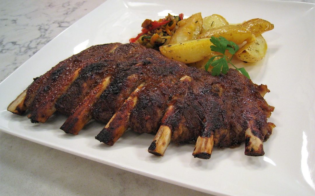 Introducir en el horno precalentado a 180º durante 20 minutos. Como guarnición de la carne haremos unas tiras de verduras salteadas. Para ello comenzaremos a dorar en una sartén, con 3 cucharadas de virgen extra, 2 dientes de ajo fileteados. Cuando comiencen a dorarse incorporaremos la otra cebolleta cortada en juliana junto con la zanahoria, el calabacín, el pimiento rojo, el puerro y las setas; todo cortado en finos bastones. Salpimentar y dejar sofreír las verduras hasta que estén cocinadas al punto deseado. Cuando las costillas lleven los 20 minutos de cocción, sacaremos la bandeja del horno, le daremos la vuelta a la carne y la volveremos a untar con más salsa. Volveremos a meter en el horno y dejaremos hornear 15 minutos. Servir las costillas junto con las patatas y los bastones de verduras salteadas.