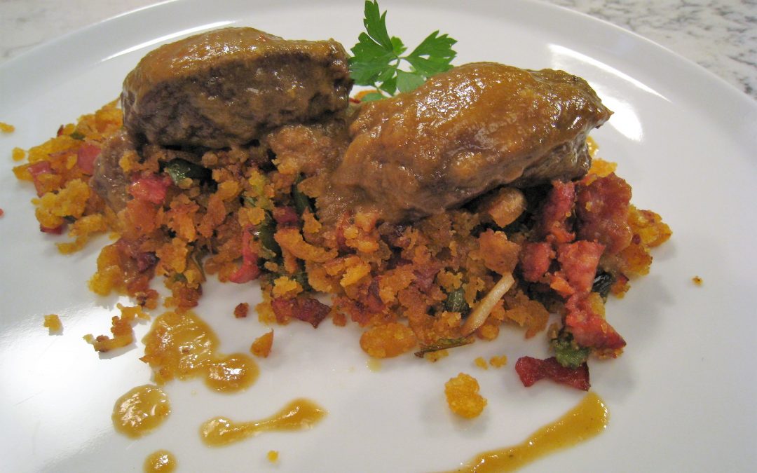 Salpimentar las carrilladas y dorarlas en un poco de aceite de oliva virgen extra. Picar y agregar la cebolla, la zanahoria y el puerro. Incorporar el tomate frito y dos hojas de laurel. Sofreír brevemente y verter el vino tinto. Dejar hervir, a fuego fuerte, unos minutos y cubrir con agua. Probar de sal y cocinar, a fuego suave, hasta que las carrilleras estén muy tiernas. Para las migas, cortar los molletes en pequeñas y finas rodajas. Humedecerlas con agua y sal y dejarlas reposar para que empapen un poco. Mientras tanto, comenzar a sofreír el pimiento verde picado, los ajos laminados y el bacón y el chorizo cortados en dados. Agregar el pan y cocinar, a fuego medio y sin parar de mover, hasta que se seque y comience a dorarse.Probar de sal y añadir las alcaparras. Por último, apartar la carrillada y las hojas de laurel del guiso, triturar las verduras hasta obtener una salsa y colar.