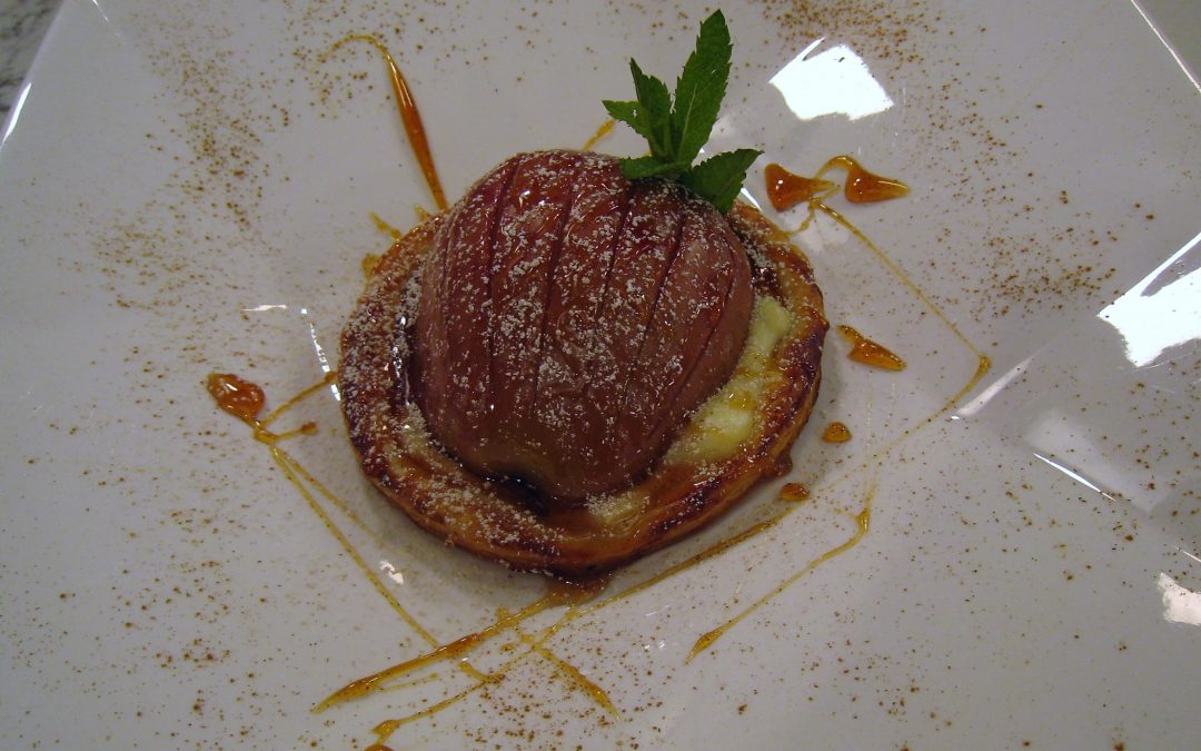 Hacer un almíbar disponiendo en una sartén 1 vaso de agua, 3/4 de vaso de miel y media vaina de vainilla natural abierta por la mitad. Dejar que comience a hervir a fuego suave. Por otro lado, cortar las manzanas a la mitad y retirar, con ayuda de un sacabolas o cucharilla, la parte central del corazón. Hacer unos cortes superficiales en la piel, introducir en el almíbar y dejar cocinar unos 5 minutos. Apartar las manzanas, dejar que se enfríen y mantener el almíbar al fuego para que reduzca y adquiera consistencia de caramelo. Por otro lado, hacer una sencilla crema mezclando el queso crema con 2 cucharadas de azúcar glasé. Cortar entonces círculos de hojaldre un poco más grandes que las medias manzanas, disponerlos encima de una placa de horno cubierta con papel vegetal y extender encima de cada hojaldre un poco de crema de queso. Finalmente, introducir onzas de chocolate en el hueco obtenido en el corazón de las manzanas y colocarlas sobre el hojaldre, con la piel hacia arriba. Mezclar 1 huevo con 1 cucharada de azúcar glasé y una pizca de canela molida. Pintar las manzanas y llevarlas al horno, precalentado a 180ºC, durante 20 minutos aproximadamente.