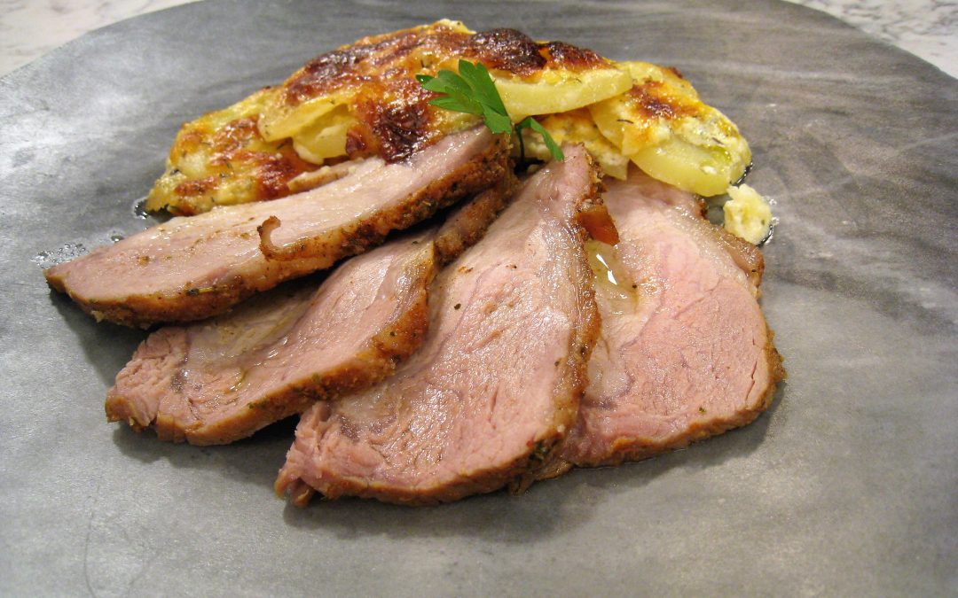 Colocar una capa de sal en una fuente de horno y poner encima el lomo adobado. Cubrir con más sal, presionar y cocinar en el horno, precalentado a 180ºC, durante unos 50 minutos. Para la guarnición, disponer en un cuenco la leche, la nata, queso rallado y una cucharadita de tomillo. Salpimentar y mezclar bien. Pelar entonces las patatas, lavarlas, secarlas un poco, cortarlas en rodajas de medio cm. de grosor aproximadamente e incorporarlas al cuenco. Remover y verter sobre una bandeja de horno cubierta con papel vegetal. Compactar y hornear, 45 minutos, a 180º C.