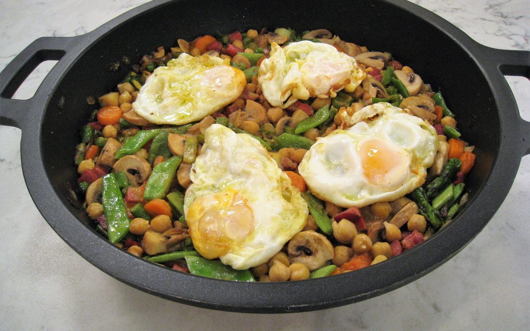 Para la menestra, picar la cebolla y comenzar a rehogarla, en una cacerola con 4 cucharadas de virgen extra, junto con el jamón cortado en taquitos. Agregar una hoja de laurel, 2 dientes de ajo fileteados y el blanco del puerro y las zanahorias, cortados en rodajas. Incorporar los guisantes, los espárragos verdes, las judías cortadas en tiras y los champiñones cortados en cuartos. Dejar cocinar, unos 10 minutos, a fuego medio. Batir 2 vasos de caldo de ave con algunos garbanzos cocidos y verter sobre las verduras. Añadir el resto de garbanzos, media cucharada de comino molido y salpimentar ligeramente. Mantener a fuego medio unos 15 minutos, hasta que el caldo haya reducido a la mitad. Por último, dorar en una sartén, con la base cubierta de virgen extra, 3 dientes de ajo fileteados. Apartar y freír al gusto los huevos.
