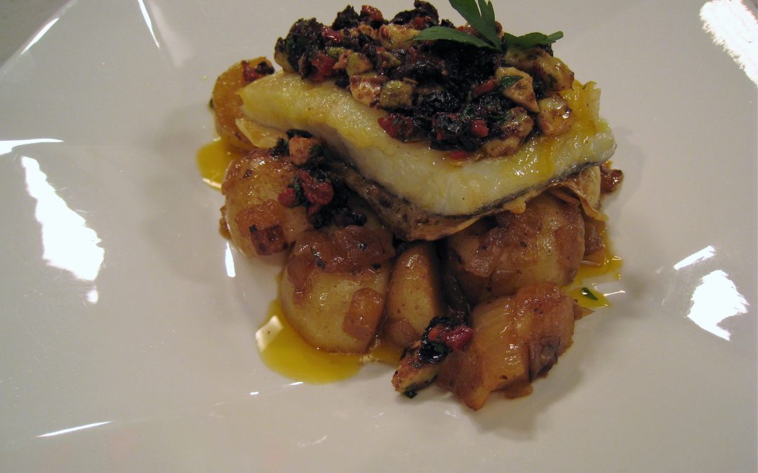 Picar las aceitunas prietas y disponerlas en un cuenco. Añadir una pizca de comino molido y un chorreón generoso de aceite de oliva virgen extra. Incorporar los pimientos del piquillo, el aguacate y perejil muy picados. Ajustar de sal, mezclar bien y reservar. Para la guarnición, lavar las patatas y cortarlas en trozos no muy grandes. Comenzar a cocinarlas, en una sartén con 4 cucharadas de virgen extra, y añadir la cebolla picada y los ajos laminados. Dejar a fuego medio durante unos 10 minutos. Verter entonces el vino blanco y un poco de jugo de limón. Salpimentar y cocinar, a fuego alto, hasta que evapore el líquido. Por último, secar los lomos de bacalao y dorarlos, por ambas caras, en una sartén con 2 cucharadas de virgen extra.