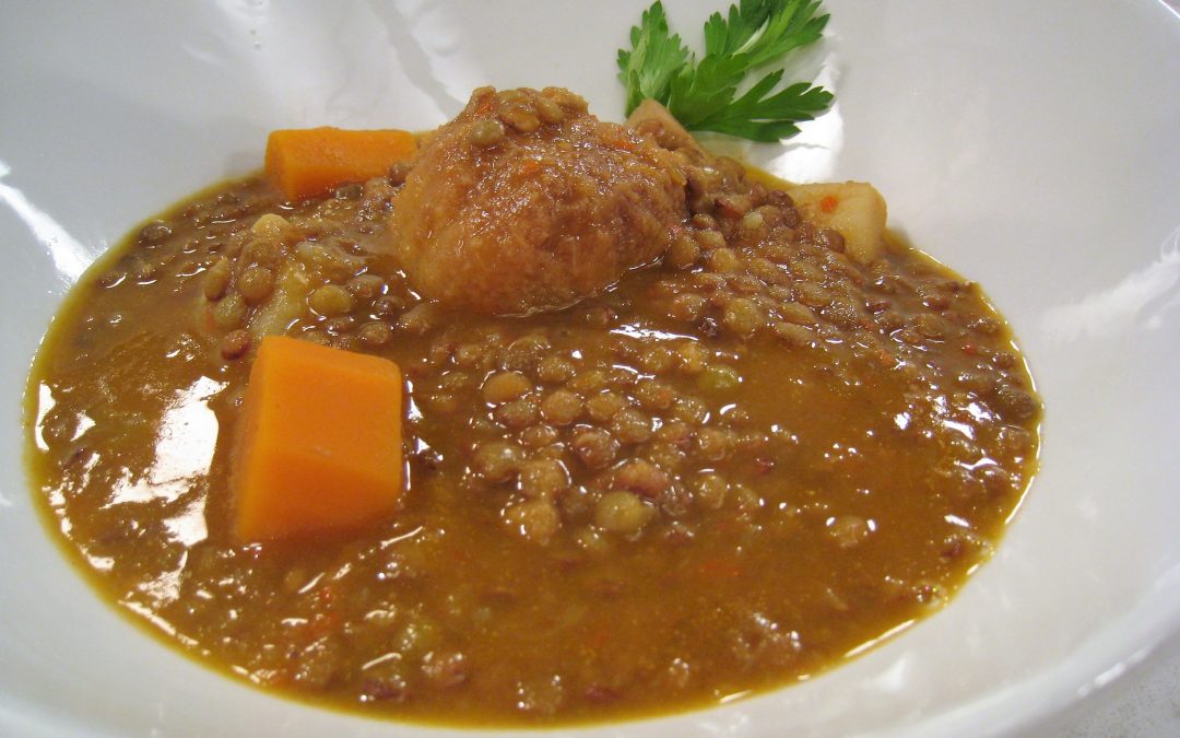 Lavar bien las lentejas y disponerlas en una cacerola. Añadir el blanco del puerro, el tomate y el pimiento rojo. Cubrir con agua, salar y llevar al fuego. Agregar 2 hojas de laurel, 2 clavos y las zanahorias y las patatas, peladas y cortadas en porciones generosas. Dejar que comience a hervir. Para las albóndigas, mezclar el arroz cocido con perejil picado y una pizca de comino molido. Incorporar 2 huevos, sal, pimienta y seguir mezclando hasta conseguir una pasta consistente, añadiendo un poco de pan rallado si fuera necesario. Hacer albóndigas e introducir en el interior una rodaja de chorizo. Pasar por huevo batido, pan rallado y freír. Para dar espesor a las lentejas, triturar en una jarra el puerro, el tomate y el pimiento rojo cocidos y devolver al guiso. Por otro lado, dorar 2 ajos laminados con virgen extra y añadir una cucharada de pimentón dulce. Remover y agregar sobre las lentejas.Finalmente, incorporar las albóndigas de arroz y chorizo en la cacerola y dejar cocinar, a fuego suave, durante unos 10 minutos.