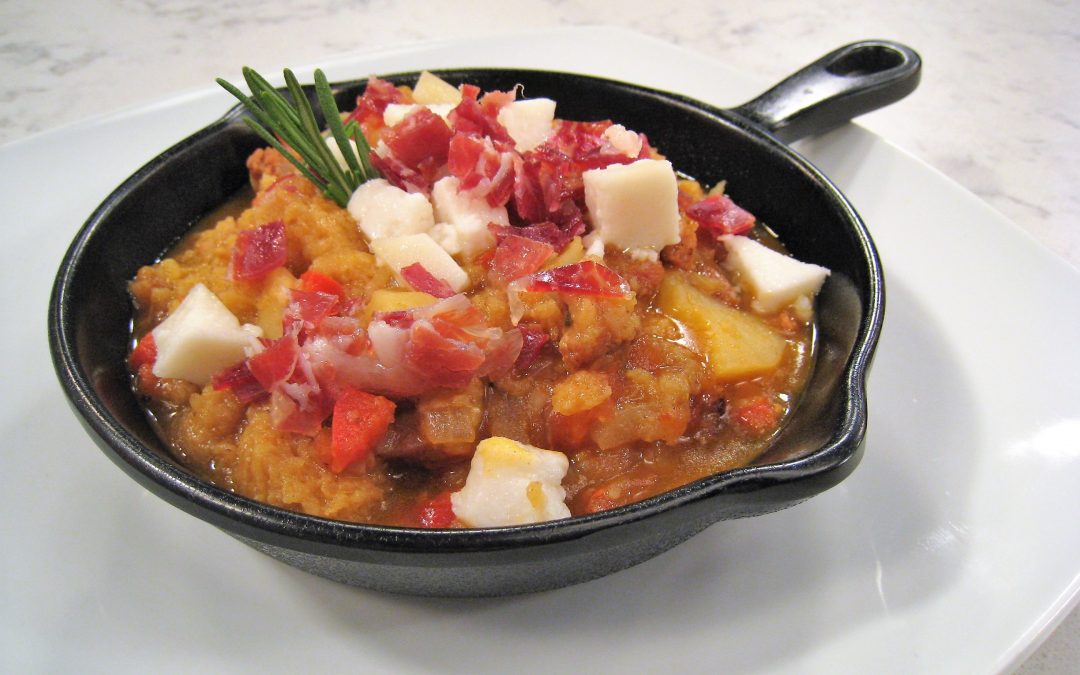 Hacer un corte en cruz a los tomates en la base y retirarles el pedúnculo. Sumergirlos en agua hirviendo durante 30 segundos o 1 minuto, apartarlos rápidamente en agua con hielo, y dejar que se enfríen. Pelarlos entonces, picarlos y reservarlos. Por otro lado, trocear en dados y comenzar a rehogar, en una cacerola con un chorreón de virgen extra, la cebolla, el pimiento y el chorizo. Añadir los ajos fileteados, una hoja de laurel y dejar cocinar unos minutos. Agregar los tomates al sofrito y dejar cocinar, unos 10 minutos, a fuego medio-alto. Mientras tanto, pelar las patatas, cortarlas en rodajas y añadirlas a la cacerola. Una vez que el tomate esté bien frito, verter el caldo de ave, 2 vasos de agua y dejar cocinar, a fuego medio, hasta que la patata esté tierna.