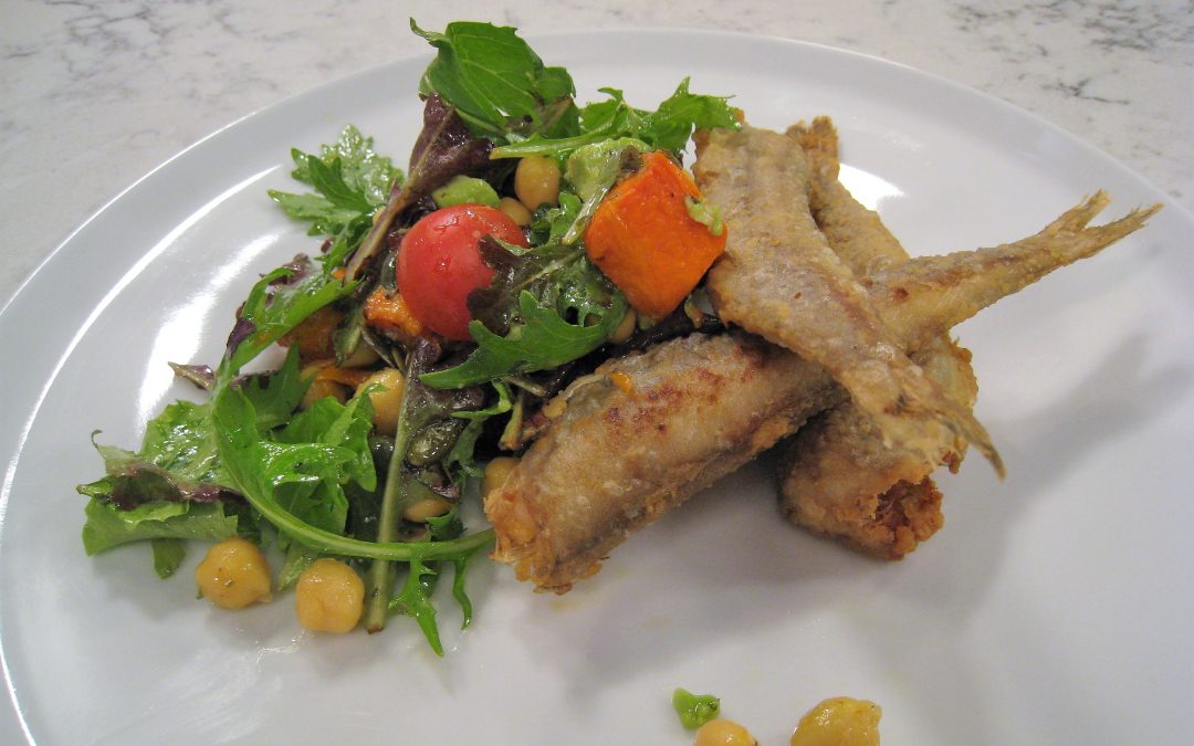 Disponer los trozos de calabaza en un cuenco, regar con un chorreón generoso de virgen extra y salpimentar. Mezclar bien, extender en una fuente y cocinar, en el horno precalentado a 180ºC, durante 45 minutos. Por otro lado, limpiar las bacaladillas dando un corte justo por debajo de la cabeza, cortando la espina pero sin llegar a cortar el pescado por completo y tirar de la cabeza hacia atrás para sacar las tripas. Cubrir con un papel húmedo y reservar al frío. Para la ensalada, disponer las hojas de lechuga en la base de una ensaladera y añadir encima las porciones frías de calabaza asada, los garbanzos cocidos escurridos, las pipas de calabaza, los tomates cherry cortados a la mitad y el aguacate troceado. Para la vinagreta, verter en un recipiente 6 cucharadas de virgen extra, 3 cucharadas de vinagre, 1 cucharada de miel, una cucharada de orégano, sal y pimienta. Mezclar bien y reservar. Finalmente, salar las bacaladillas, pasarlas por harina y freírlas en una sartén con aceite de oliva virgen bien caliente.