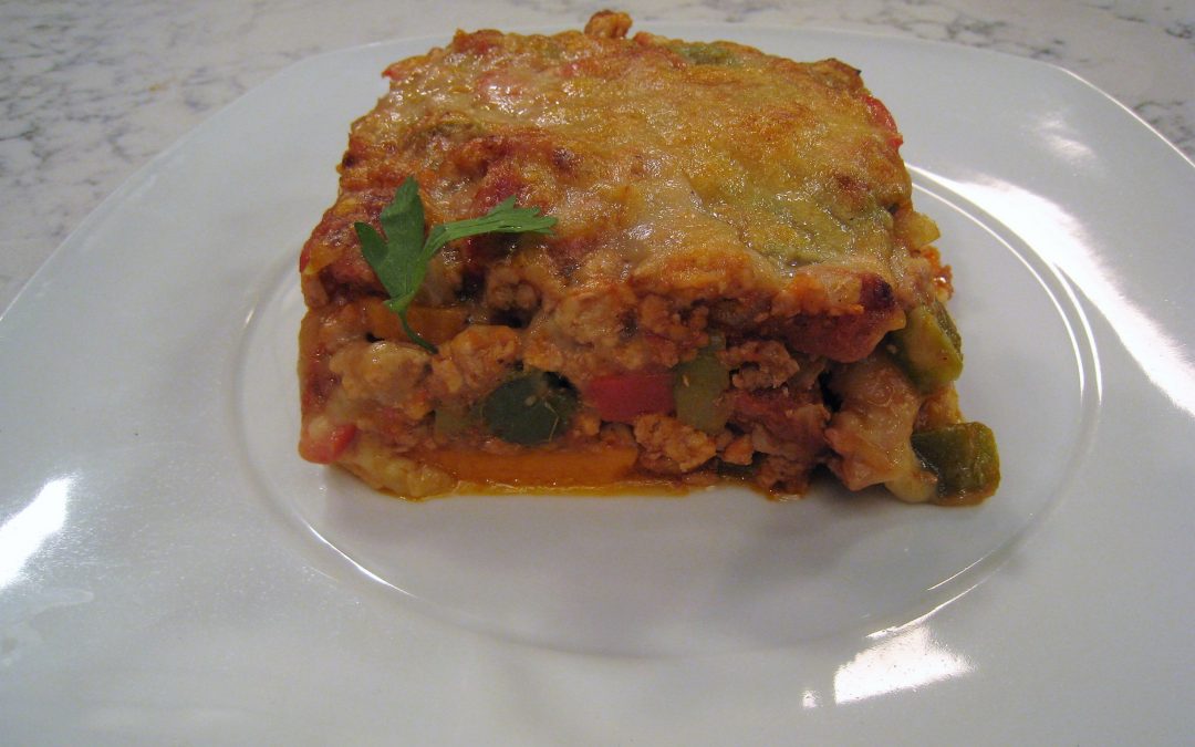 Pelar las batatas y cortarlas en rodajas de 1 cm aproximadamente. Disponerlas sobre una fuente de horno cubierta con papel vegetal engrasado y rociar un poco más de virgen extra por encima. Cocinar en el horno, precalentado a 185ºC., durante unos 30 minutos. Picar las cebollas y comenzar a rehogarlas, en aceite de oliva virgen extra, junto con una hoja de laurel y los pimientos picados. Agregar la carne de cerdo y el chorizo troceado. Sofreír brevemente y añadir los tomates triturados. Salpimentar y, cuando comience a hervir, bajar el fuego y dejar cocinar unos 20 minutos. Para la salsa, calentar 5 o 6 cucharadas de virgen extra en una sartén y cocinar 3 cucharadas generosas de harina. Remover bien y verter, poco a poco, el caldo de carne, hasta que hierva y tengamos una textura ligera. Salpimentar y dejar hervir unos minutos. Finalmente, hacer un napoleón o milhojas alternando capas de batata asada, carne con verduras y salsa. Terminar con salsa por encima y rallar abundante queso. Hornear, a 200º C., durante 15 minutos aproximadamente.
