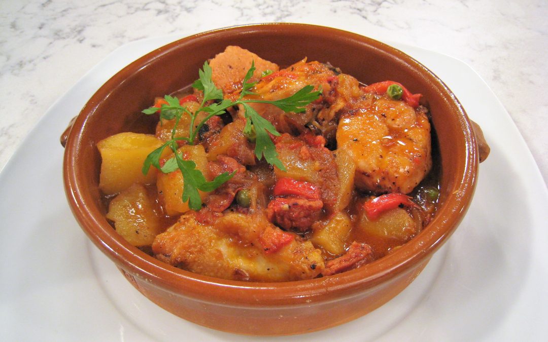 Salpimentar el pollo, enharinarlo ligeramente y dorarlo con 4 cucharadas de virgen extra. Apartar y reservar. En el aceite anterior, comenzar a rehogar el bacón cortado en daditos y las cebollas y los pimientos, cortados en juliana. Añadir 3 dientes de ajo laminados, 2 hojas de laurel y dejar cocinar unos minutos. Pelar las patatas, trocearlas y agregarlas a la cacerola. Incorporar una cucharada generosa de pimentón dulce y los tomates triturados. Dejar cocinar hasta que el tomate esté frito. Devolver entonces el pollo, verter el vino blanco y dejar hervir un minuto. Por último, cortar el chorizo en rodajas y añadirlas junto con los guisantes. Cubrir con agua, salpimentar y dejar cocinar hasta que la carne esté muy tierna.