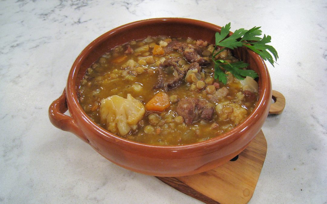 Limpiar las carrilleras, trocearlas y comenzar a dorarlas en una cacerola con un buen chorreón de aceite de oliva virgen extra. Agregar la cebolla picada, las zanahorias cortadas en medias rodajas, la panceta troceada, los ajos laminados y el chorizo picado en pequeños dados. Sofreír brevemente y añadir los tomates rallados. Salpimentar y dejar cocinar unos minutos. Añadir 2 clavos y el repollo cortado en pequeñas tiras. Cubrir con agua, salar y dejar que comience a hervir. Cuando las carrilleras empiecen a ponerse tiernas, añadir las lentejas escurridas, que hemos tenido la víspera en remojo. Finalmente, incorporar la coliflor, sin tallo y troceada, y dejar cocinar a fuego medio hasta que las lentejas y las carrilleras estén en su punto.
