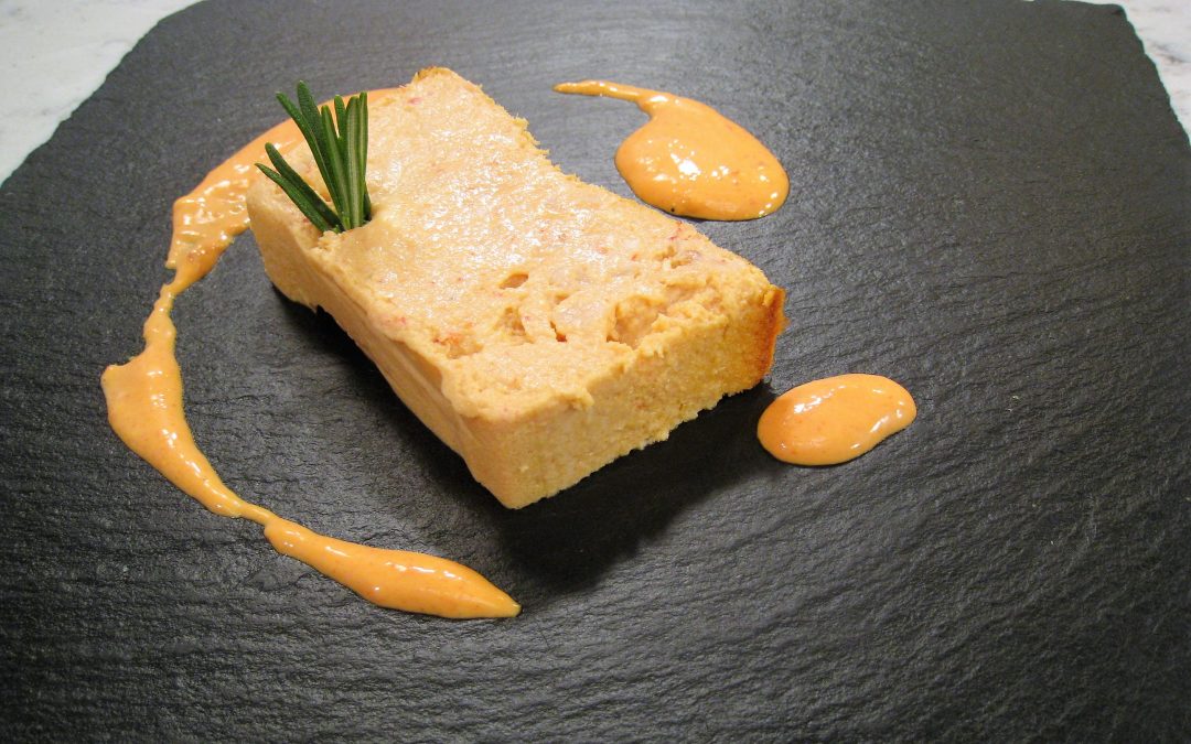 Dorar las cabezas y caparazones de las gambas en una sartén con 3 cucharadas de virgen extra. Apartar y, en el aceite anterior, añadir los ajos picados y los cuerpos de las gambas picados. Salar y verter el brandy. Flambear y, cuando se apague la llama, incorporar el vaso de nata. Dejar hervir un par de minutos y apartar del calor. Disponer en una jarra el atún escurrido, 3 pimientos de piquillo, el vaso de leche, 5 huevos, las rebanadas de pan de molde sin corteza, 3 cucharadas de tomate frito, un poco de sal y pimienta. Triturar y verter en un cuenco. Agregar las gambas con la nata y mezclar bien. Verter sobre un molde, con la base cubierta de papel vegetal, y llevar al horno, precalentado a 175ºC y al baño María, durante unos 45 minutos aproximadamente. Finalmente, triturar la mayonesa con 5 piquillos y unas gotas de zumo de naranja.