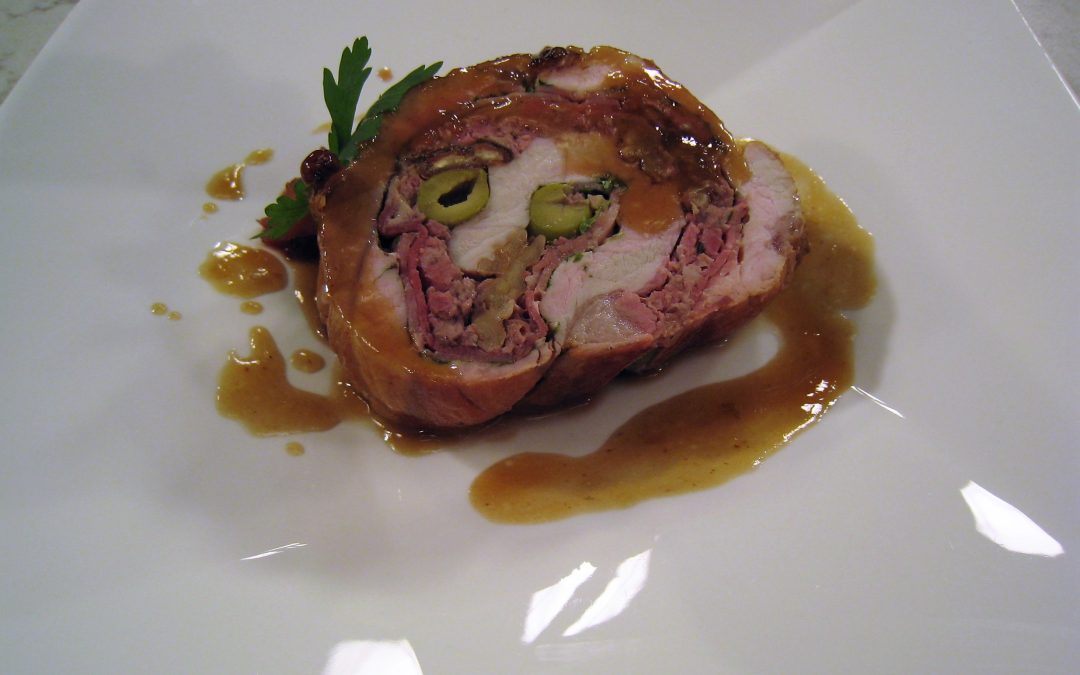 Disponer en una jarra 1 diente de ajo, 2 dedos de virgen extra, un buen manojo de hojas de perejil fresco y una cucharada de tomillo seco. Triturar y reservar. Para el relleno, mezclar en un bol la carne picada con las setas cortadas en pequeños dados. Por otro lado, abrir la cinta de lomo en forma de libro, colocar papel de horno encima y espalmar con ayuda del rodillo de cocina. Salpimentar el lomo y pintar con el aceite de perejil, ajo y tomillo que teníamos reservado. Disponer encima las lonchas de bacón y jamón, la carne picada, algunos dátiles, aceitunas y nueces. Enrollar, bridar, salpimentar por el exterior y dorar al fuego con un poco de virgen extra. Verter el vino, el caldo de carne y llevar al horno, precalentado a 180º C., durante 1 hora aproximadamente. Para la guarnición, trocear las cebollas y comenzar a cocinarlas junto con las manzanas, peladas y cortadas en dados, 100 g. de azúcar moreno, 1 rama de canela, 2 clavos, 1/3 de vaso de vinagre, 1 vaso de vino dulce, sal y pimienta. Dejar cocinar unos 40 minutos, a fuego medio, hasta que tengamos una textura de compota. Finalmente, sacar la carne del horno, poner el caldo del asado colado en un cazo y llevar al fuego para que reduzca.