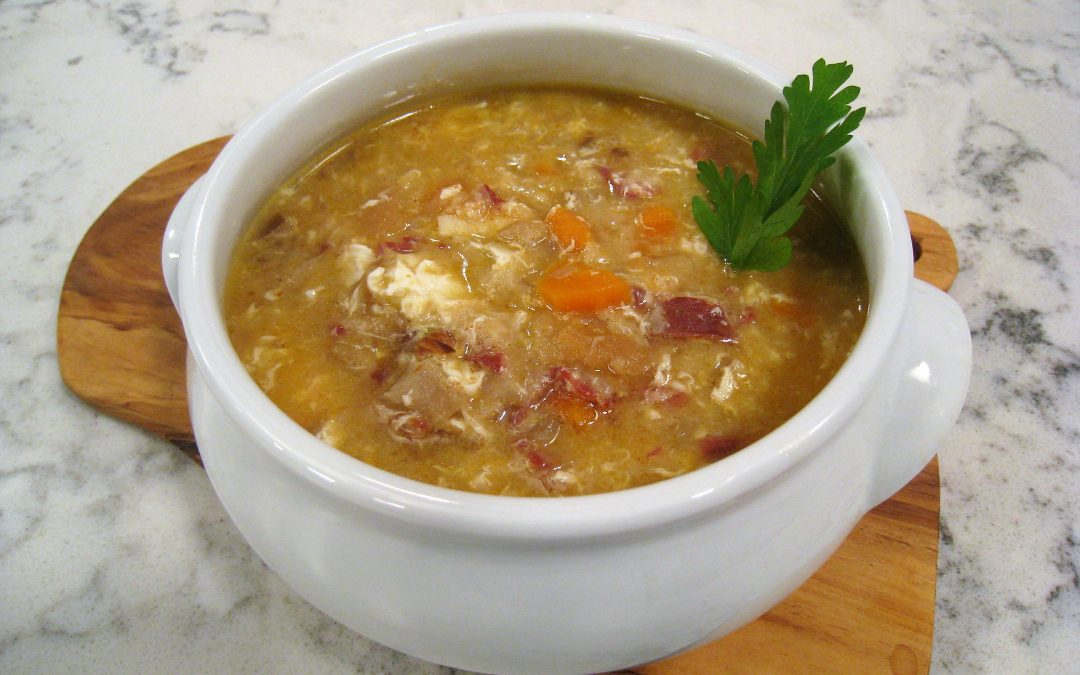 Agregar el jamón picado y el pan troceado. Sofreír brevemente, incorporar una cucharada generosa de pimentón y cubrir con el caldo de ave. Dejar cocer, unos 15 minutos, a fuego medio. Transcurrido este tiempo agregaremos los huevos y removeremos con energía para que se mezclen bien y cuajen en nuestra sopa justo antes de ir a la mesa.