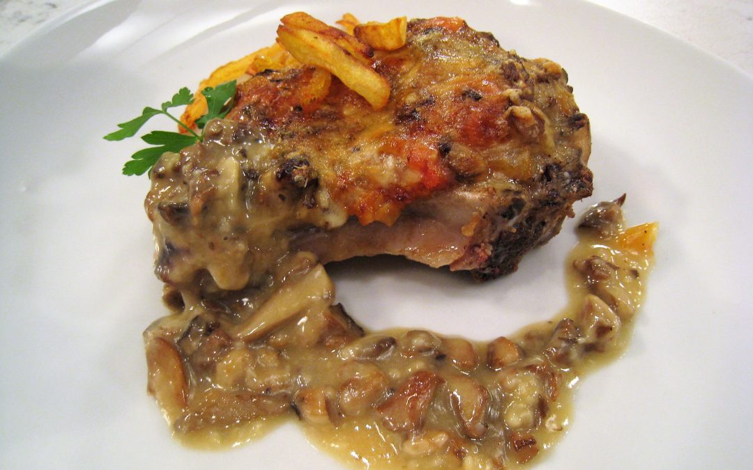Picar la cebolla y comenzar a rehogarla, en aceite de oliva virgen extra, junto con dos dientes de ajo fileteados. Agregar los tomates, pelados y troceados, una pizca de azúcar, sal y pimienta. Dejar cocinar hasta que el tomate esté frito. Dorar las chuletas de lomo de cerdo por ambas caras, salpimentar y reservar en una fuente de horno. En la sartén anterior, saltear las setas muy picadas. Añadir un par de cucharadas generosas de harina e ir agregando, poco a poco, el caldo de carne para hacer una bechamel no muy espesa. Salpimentar. Por último, extender sobre la carne el tomate frito. Sobre éste la bechamel de setas y espolvorear con queso rallado y orégano. Hornear, a 200º C., hasta gratinar. Servir las chuletas acompañadas de unas sencillas patatas fritas.