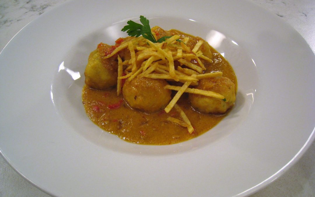 Para la salsa, freír en una cacerola, con un chorreón de virgen extra, 3 rebanadas de pan, apartarlas y reservarlas. En el aceite anterior, rehogar 1 cebolla con 2 dientes de ajo picados y el pimiento rojo cortado en pequeños dados. Dejar sofreír unos minutos. Por otro lado, disponer en una jarra el pan, las almendras fritas, unas hebras de azafrán y una pizca de comino molido. Triturar con ayuda del agua necesaria. Incorporar el majao a la cacerola y añadir agua. Ajustar de sal y dejar hervir a fuego medio. Para las albóndigas, disponer en una jarra la cebolleta, 2 dientes de ajo, un poco de perejil y 1/3 de vaso de vino blanco. Triturar y disponer en un cuenco. Agregar el choco limpio y cortado en dados, 2 huevos y sal. Triturar para que la masa quede más fina y terminar de ajustar el espesor de la masa con pan rallado. Hacer pequeñas bolas y dorarlas en una sartén con poco aceite. Escurrirlas, agregarlas directamente en la salsa y dejar que se terminen de cocinar entre 15 y 20 minutos. Opcionalmente, podemos acompañar nuestras albóndigas con unas sencillas patatas paja.