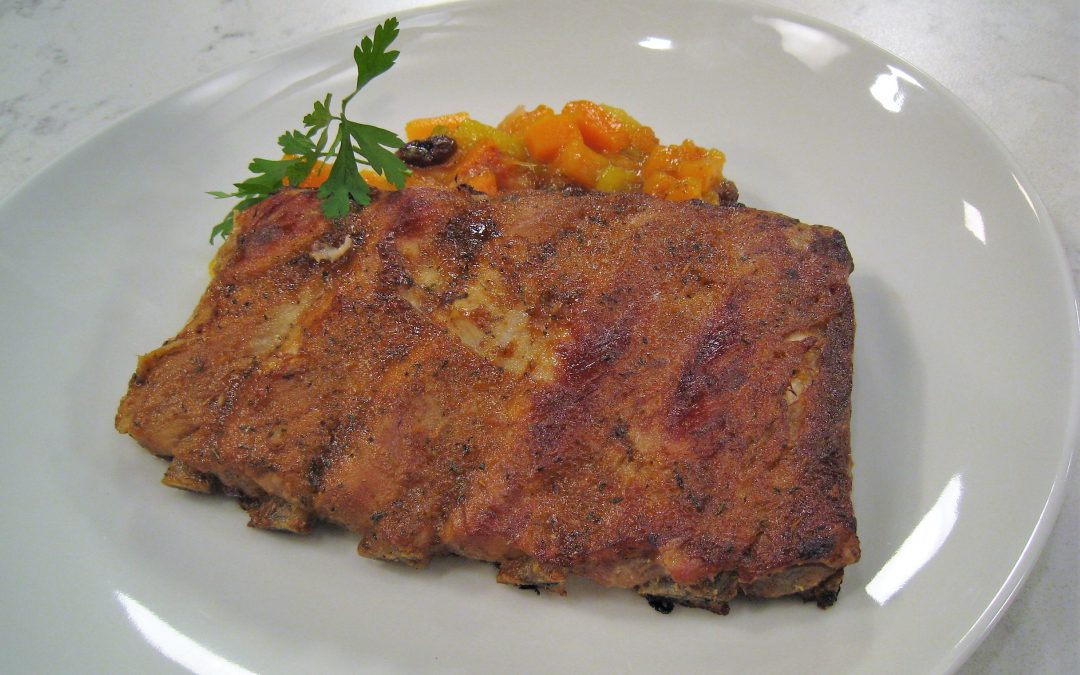Introducir las costillas de cerdo, en agua hirviendo, junto con 3 dientes de ajo enteros y 1 cebolleta. Dejar cocer durante unos 30 minutos. Por otro lado, disponer en una jarra 2 cucharadas soperas de miel, 2 cucharadas de salsa de soja, 2 cucharadas de ketchup, 2 rodajas de piña fresca, un chorréon de virgen extra, 1/3 de vaso de agua, tomillo seco y orégano. Añadir los dientes de ajo y la cebolleta cocidos y triturar bien hasta obtener una salsa. Apartar entonces las costillas del agua, secarlas y disponerlas en la bandeja de horno sobre papel vegetal. Salpimentar y extender, con ayuda de una brocha, salsa que acabamos de preparar. Llevar al horno, precalentado a 185ºC, con el lado que tiene menos carne hacia arriba. Dejar cocinar durante 20 minutos. Para la guarnición, picar la cebolleta y comenzar a rehogarla, a fuego medio, con una cayena y 1 diente de ajo fileteado. Añadir el mango, pelado y troceado, la calabaza cortada en dados, las pasas, 4 clavos, 1 rama de canela, el azúcar y un chorro generoso de vinagre. Salpimentar, cubrir con 2 vasos de agua y dejar cocinar una 1/2 hora, removiendo con frecuencia, hasta conseguir una buena consistencia. Cuando las costillas lleven 20 minutos en el horno, darles la vuelta, volver a pintar con la salsa y seguir horneándolas, entre 15 y 20 minutos, hasta que estén hechas.
