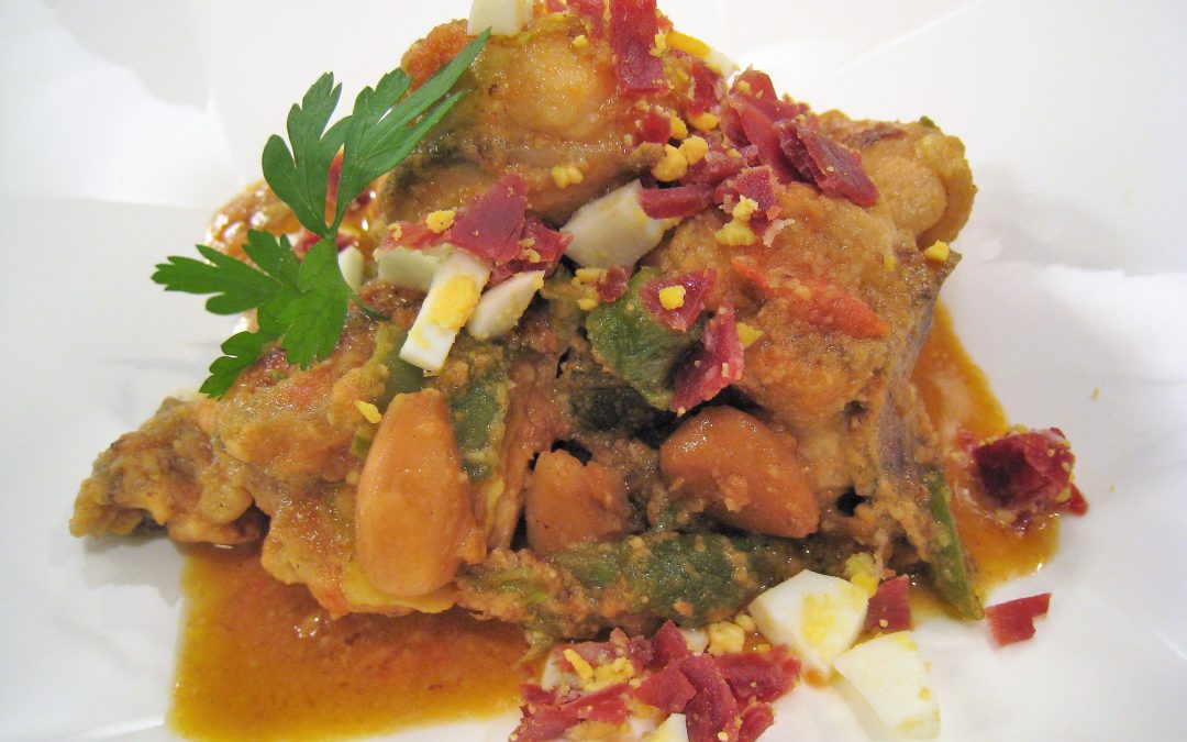 Por último, para la guarnición, disponer en un cuenco el jamón picado y el huevo cocido cortado en dados. Salpimentar, verter un chorrito de virgen extra y mezclar. Servir nuestra receta serrana sobre la mitad de un pan árabe, para que empape la salsa, y ponerle picadillo de jamón y huevo por encima.