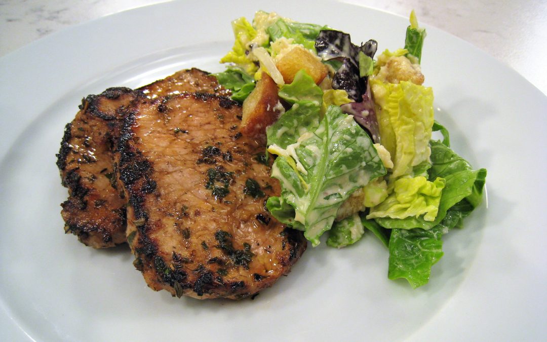Cortar la cinta de lomo en filetes de 1cm. aprox. de grosor y colocarlos en una fuente. Para la marinada, disponer en un cuenco 2 ajos picados, una cucharada rasante de orégano, un poco de tomillo seco, perejil picado, el jugo de ½ limón, 3 cucharadas de salsa Perrin´s, 4 cucharadas soperas de aceite de oliva virgen extra, sal y pimienta. Mezclar, verter sobre la carne, cubrir con plástico y dejar reposar en el frigorífico unos 30 minutos. Calentar, en una sartén, un poco de virgen extra y 1 diente de ajo entero. Cuando comience a dorarse añadir el pan cortado en pequeñas porciones y freírlas. Apartar sobre papel para que escurra. Para la vinagreta Cesar, disponer en una jarra el diente de ajo pelado, 1 huevo y el doble de volumen de aceite de oliva virgen extra. Batir hasta que emulsione como una mayonesa y agregar 3 filetes de anchoas y unas gotas de limón. Terminar de batir y reservar al frío. Por otro lado, limpiar la lechuga, trocearla y disponerla en una ensaladera. Incorporar los dados de pan frito, abundante queso recién rallado y reservar. Finalmente, sacar la carne del adobo y cocinarla por los dos lados. Aliñar la ensalada con la vinagreta justo antes de servir.