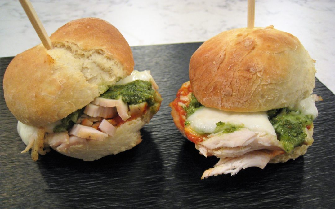 Calentar la leche y disolver la levadura en esta. Por otro lado, hacer un volcán con la harina dentro de un cuenco y verter la leche con la levadura en el hueco. Incorporar 2 huevos batidos, 1 cucharada de virgen extra y comenzar a mezclar. Agregar un pellizco de sal y seguir mezclando hasta obtener una masa homogénea y manejable. Coger pequeñas porciones y hacer bollitos. Colocarlos en una bandeja con papel vegetal e introducirlos en el horno apagado. Encenderlo a 210ºC, con ventilador, y dejar hornear hasta que empiecen a dorarse. Para el pesto, disponer en una jarra 1 manojo de hojas de albahaca, 1 diente de ajo, las almendras fritas, sal y pimienta. Añadir 1/2 vaso de aceite de oliva virgen extra y triturar bien. Verter en un cuenco, añadir el queso rallado, mezclar y reservar. Sacar el pan del horno y dejar que pierda temperatura. Abrirlos y colocar en medio un poco de tomate frito, pechuga de pollo desmigada, pesto y una rodaja de mozarella fresca. Cerrar, pintar con un poco de virgen extra y llevar al horno, precalentado a 210ºC, durante 5 minutos.
