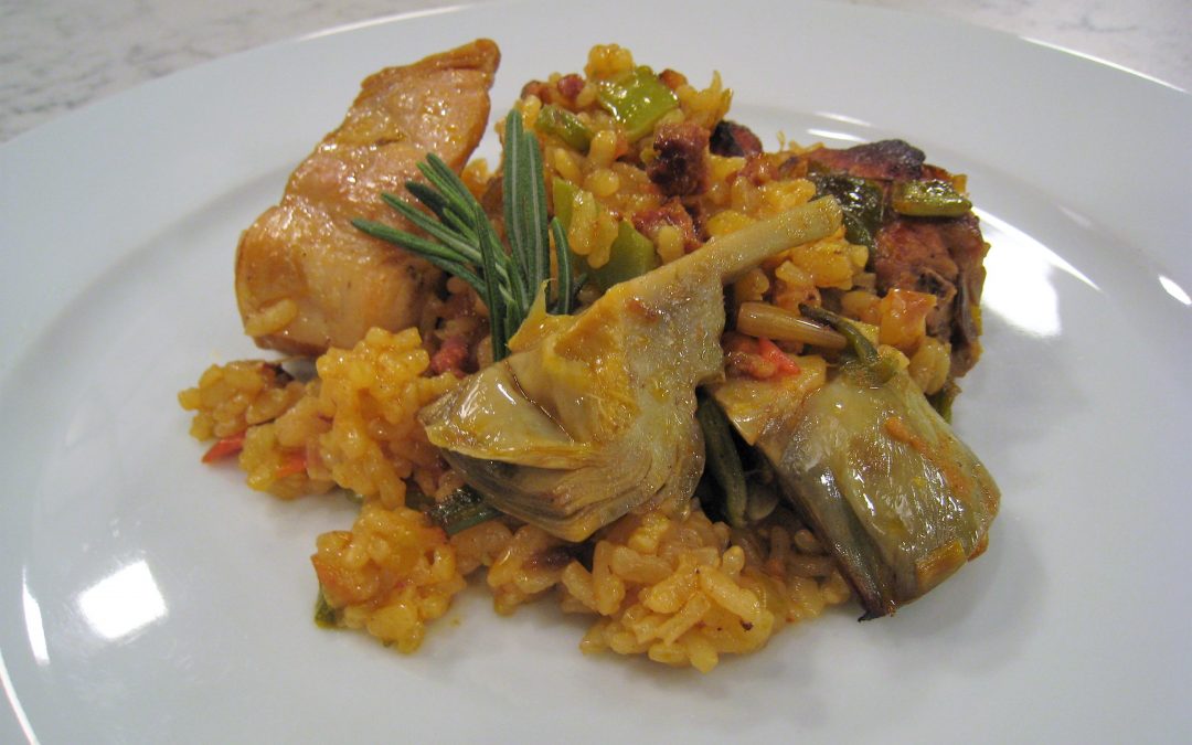 Salpimentar la carne y comenzar a dorarla, en una paellera o cacerola, con un chorreón de virgen extra. Incorporar los dientes de ajo, enteros y golpeados, y el puerro y los pimientos, picados. Añadir unas hebras de azafrán y el chorizo troceado en dados pequeños. Dejar cocinar unos minutos. Picar los tomates y añadirlos al sofrito junto con las las judías verdes, limpias de hebras laterales y cortadas en pequeñas porciones, y los corazones de las alcachofas. Incorporar el arroz, sofreírlo brevemente y verter el caldo, en la proporción de 2 vasos y medio de caldo por cada vaso de arroz. Dejar que comience a hervir a fuego fuerte, remover un par de minutos y terminar de cocinar,en el horno precalentado a 240ºC, hasta que cumpla 15 minutos hirviendo. Pasado este tiempo, sacaremos el arroz del horno, repartiremos unas ramas de romero por encima y llevaremos a la mesa.