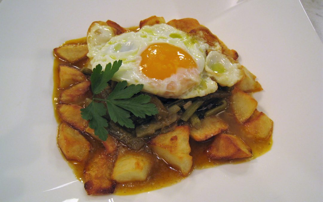 Desleír con la copa de manzanilla y terminar de majar. Escurrir bien las tagarninas, reservando un poco de agua de coción, y saltearlas, unos minutos, en la misma cacerola y aceite donde hemos frito el pan y los ajos. Incorporar el majado reservado, mezclar bien y verter un poco de agua de cocción. Dejar cocinar, entre 5 y 10 minutos, a fuego medio. Mientras tanto, pelar las patatas, cortarlas en pequeños gajos y freírlos en una sartén con virgen extra. Apartar, salar y, en la misma sartén, freír los huevos al gusto.