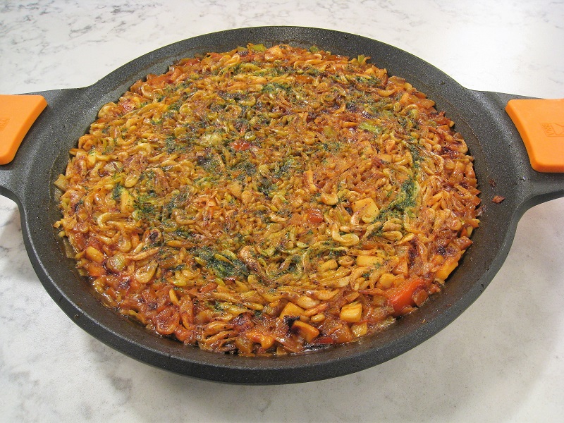 Para el sofrito, comenzar a rehogar en una paellera, con aceite de oliva virgen extra, los calamares troceados en pequeñas porciones junto con el azafrán en hebras y el blanco de los puerros, 4 dientes de ajo y el pimiento, picados. Incorporar una cucharada de pimentón y los tomates rallados. Dejar sofreír, unos 10 minutos, a fuego medio. Agregar a la paellera 1 vaso colmado de arroz, mezclar bien y cubrir con 2 vasos y medio de caldo de pescado. Dejar que comience a hervir. Para la picada, disponer en una jarra un buen manojo de hojas de perejil y 1 diente de ajo. Verter 1/3 de vaso de aceite de oliva virgen extra y triturar bien. Cuando el arroz lleve 10 minutos de cocción, añadir los camarones y mezclar suavemente. Regar con la picada e introducir en el horno, precalentado a 240ºC, durante 5 minutos.