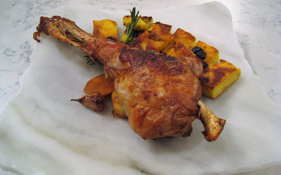Limpiar y deshuesar las piernas de cordero. Dorarlas en una sartén con un poco de virgen extra y disponerlas sobre las rodajas de patatas. Salpimentarlas, añadir romero fresco, un chorrito de aceite y 4 dientes de ajo, enteros y golpeados. Introducirlas en el horno, precalentado a 190ºC, durante 1 hora aproximadamente.