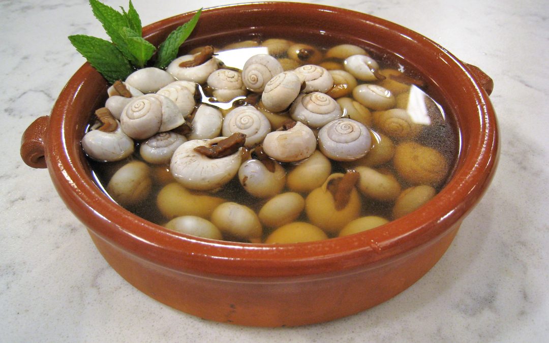 Lavar varias veces los caracoles en agua, hasta que ésta empiece a salir limpia. Escurrirlos, disponerlos en una olla cubiertos de agua fría, tapar y dejar reposar hasta que hayan salido los caracoles del caparazón. Llevar entonces al fuego y dejar a baja temperatura. Una vez que el agua de los caracoles haya cogido temperatura y estén todos los cuerpos fuera, retirar la tapadera y subir la intensidad del calor a fuego alto. Salar y cocinar, durante 30 minutos, retirando la abundante espuma que van desprendiendo durante la cocción. Mientras tanto, partir la cabeza de ajos por la mitad y tostarla en una sartén con una cucharada de virgen extra. Por otro lado, disponer en un mortero 1 trocito de jengibre, 1 cucharada generosa de comino, 1 de pimienta negra, 1 guindilla y 3 cucharadas de cilantro. Majar bien, disponer sobre una gasa y anudar. Pasados los 30 minutos de cocción de los caracoles, escurrirlos y volver a ponerlos al fuego en una cacerola cubiertos con agua. Añadir un puñado de sal, la cebolla entera pelada, la “muñequilla” con las especias, los ajos tostados y una porción de hinojo para que nos quede más limpio y aromático el caldo. Dejar cocer, a fuego medio-alto, durante 1 hora aproximadamente. Justo antes de servir, aromatizaremos el caldo removiéndolo con un ramillete de menta o hierbabuena.