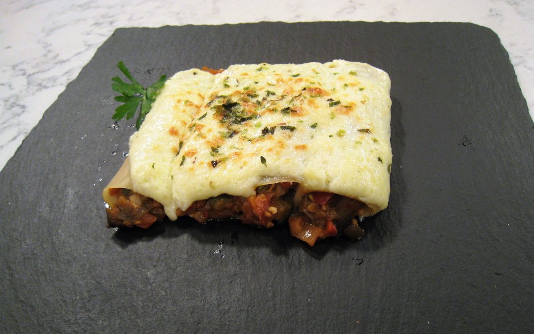 Para el pisto, picar y comenzar a rehogar, en una sartén con aceite de oliva virgen extra, la cebolla, los ajos, el pimiento, el calabacín y la berenjena. Añadir los tomates troceados, salpimentar y dejar cocinar. Mientras tanto, sumergir las placas de pasta en agua caliente para que se hidraten. Sacar la pasta del agua, extenderla sobre un paño limpio de cocina y secarla. Disponer un poco de pisto frío sobre cada placa, enrollar dándole la forma característica de rulo de canelón y colocarlos sobre una fuente engrasada. Para la bechamel, verter 1/3 de vaso de virgen extra en una sartén y llevar al fuego. Incorporar 3 cucharadas colmadas de harina, mezclar con la varilla y, cuando tengamos una masa homogénea, agregar la leche, poco a poco, hasta obtener la textura de crema ligera. Salpimentar, extender sobre los canelones, rallar abundante queso por encima, espolvorear con orégano y llevar al horno, precalentado a 210ºC., hasta que el queso gratine.