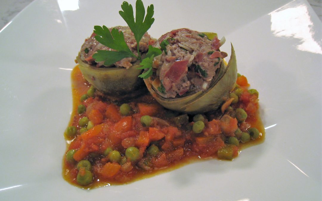 Picar la cebolla y comenzar a rehogarla con los dientes de ajo laminados y una hoja de laurel. Agregar el pimiento picado, los tomates triturados y los guisantes. Salpimentar, tapar y dejar rehogar unos minutos a fuego medio. Por otro lado, disponer al fuego una cacerola con agua y sal. Limpiar los alcauciles, retirando las hojas externas, el tallo y los “pelillos” que tiene en el corazón. Introducirlos en el agua y dejar cocer hasta que comiencen a estar tiernos. Retirar los alcauciles del agua y dejarlos atemperar boca abajo sobre papel de cocina. Para el relleno, disponer en un recipiente la carne picada, el huevo y la cebolleta, 2 dientes de ajo, 150g. de jamón y perejil, todo bien picado. Salpimentar y mezclar bien. Rellenar los corazones de los alcauciles y disponerlos sobre las verduras que tenemos rehogando en el fuego. Tapar y dejar cocinar, entre 15 y 20 minutos, a fuego medio.
