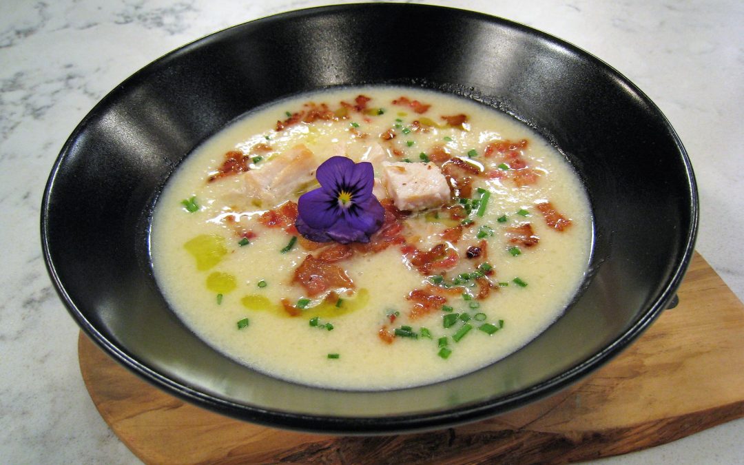 Cortar el pan en bastones y disponerlos en la bandeja de horno cubierta con papel vegetal. Pintarlos con un poco de aceite de oliva virgen extra y cocinarlos, en el horno precalentado a 180ºC, hasta que el pan se haya tostado y dorado. Por otro lado, dorar por ambas caras, en una sartén con virgen extra, los filetes de pollo. Salpimentar, apartar y reservar. En el aceite anterior, freír el bacón picado en daditos hasta que esté bien crujiente. Apartar sobre papel de cocina para que escurra. Para la sopa, picar y sofreír en una cacerola, con 3 cucharadas de virgen extra, las cebollas, el diente de ajo y la penca de apio. Añadir 3 cucharadas colmadas de harina, cocinarla brevemente y verter 3 vasos de caldo de ave. Dejar cocinar, 15 minutos, a fuego lento. Triturar entonces y agregar la nata y el queso desmenuzado. Salpimentar y mantener a fuego lento para que el queso se vaya derritiendo y la nata se cocine. Servir la sopa de queso en un plato y repartir por encima dados de pollo y bacón, cebollino picado y un poco de pimienta recién molida. Servir acompañada de un bastón de pan y terminar con un chorrito de virgen extra por encima.