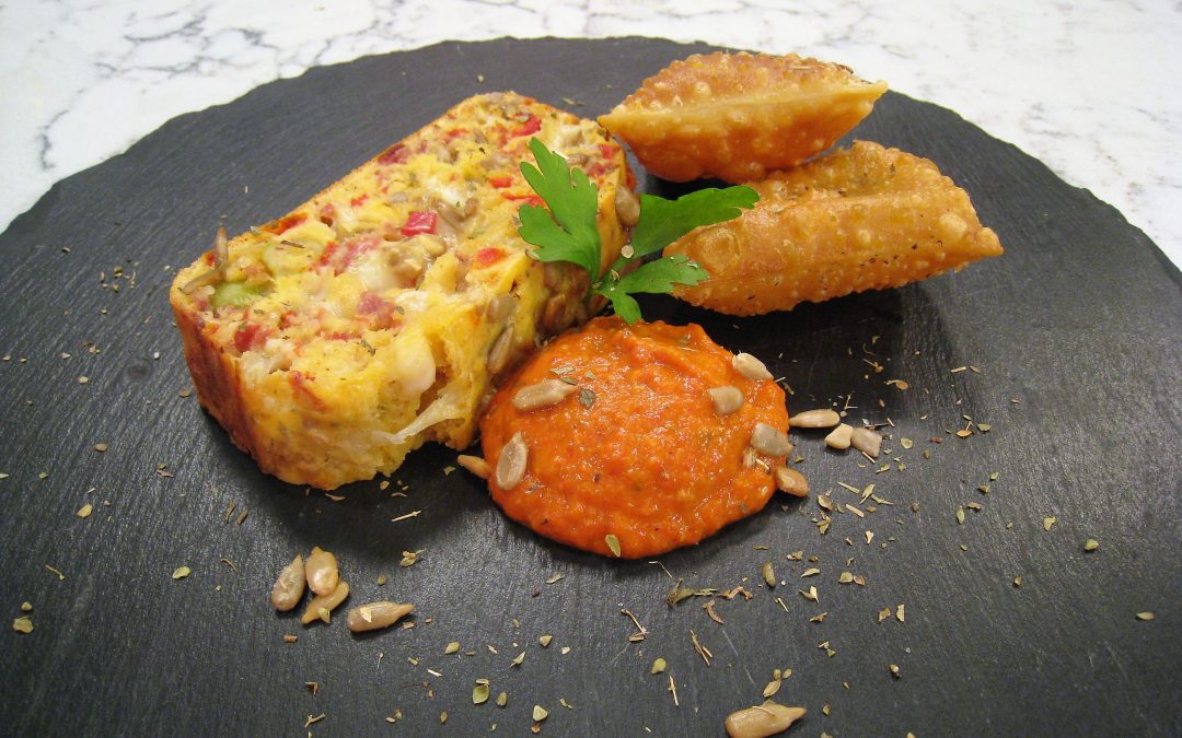 Añadir los huevos, la leche y el queso rallado. Mezclar y agregar el jamón picado, un poco de orégano, las aceitunas y los piquillos troceados y algunas pipas peladas, salpimentar y mezclar bien.