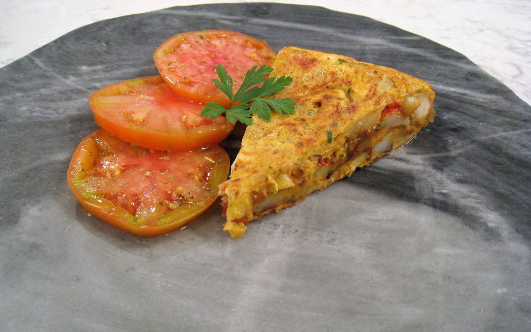 Para la tortilla comenzar a dorar en una cacerola con un chorreón generoso de aceite las cabezas y caparazones de los langostinos. Una vez estén fritos los apartaremos y desecharemos. En el mismo aceite, bajaremos la intensidad del fuego y comenzaremos a sofreír la cebolla, los ajos pelados, el pimiento rojo, el verde y el choco; todo limpio y troceado en daditos. Pelar las patatas, cortarlas en cuartos y cada cuarto en rodajas no muy gruesas. Las cuales iremos agregando a la cacerola y cocinando hasta que estén tiernas. Cascar los huevos en un cuenco y agregar los cuerpos de los langostinos troceados en pequeñas porciones y perejil picado. Verter el contenido de la cacerola sobre los huevos batidos, salpimentar y remover suavemente para que se mezclen bien todos los ingredientes. Poner una sartén grande al fuego con unas cucharadas de virgen extra y dejar que se caliente bien. Cuando esté bien caliente agregaremos la mezcla de tortilla y cocinaremos unos segundos; removiendo durante los primeros segundos. Tan solo nos restará extenderla bien por la sartén dándole forma y cocinarla por ambos lados. Como acompañamiento podemos cortar los tomates de ensalada en cuñas y disponerlas en un cuenco. Aliñar con un poco de sal, orégano, 3 cucharadas de vinagre y 6 cucharadas de virgen extra. Remover bien y servir como guarnición de la tortilla.
