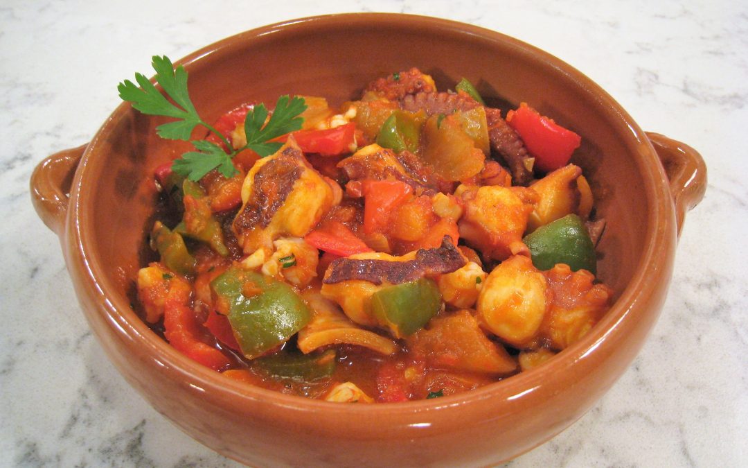 Para el ajoarriero comenzaremos a rehogar las cebollas y los pimientos cortados en dados grandes junto con 5 dientes de ajo laminados y 1 guindilla cayena. Dejar sofreír 15 minutos.