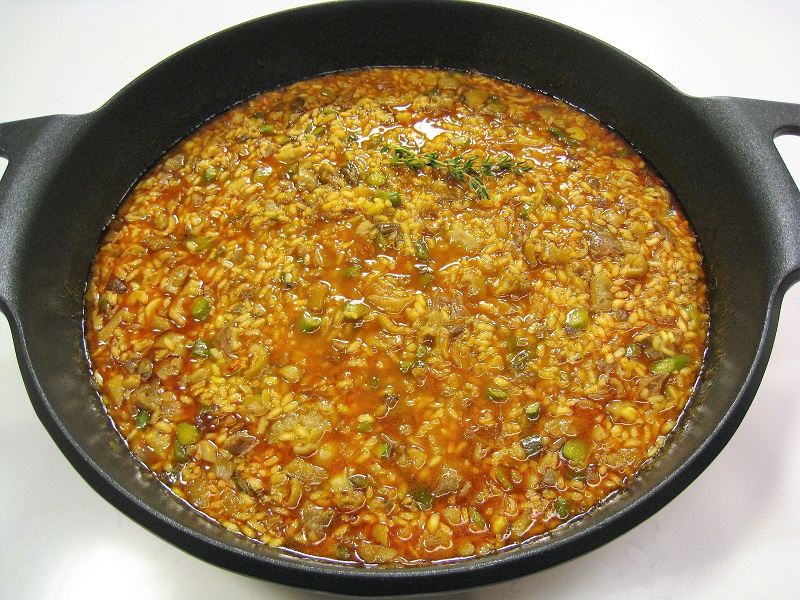 Dorar, en una cacerola con un poco de aceite de oliva virgen extra, 6 dientes de ajo, enteros y golpeados. Verter abundante agua e incorporar 1 cebolla, 2 hojas de laurel, unas ramitas de tomillo y un puñado de sal. Introducir 3 manitas de cerdo, limpias y abiertas a la mitad, junto con ½ Kg de carrilleras limpias de grasa. Dejar cocinar, unas dos horas, hasta que estén tiernas. Hace un repaso de lo que lleva cocinado. Picar y comenzar a sofreír en una cacerola o paellera, 1 cebolla, 3 ajos laminados y 1 pimiento verde. Incorporar 200g de setas troceadas, 8 espárragos verdes picados y unas hebras de azafrán. Dejar cocinar unos minutos. Mientras tanto, sacar las manitas, deshuesarlas y picarlas. Trocear también las carrilleras y reservarlas junto con las manitas. Añadir entonces al sofrito media cucharada de pimentón dulce y 1/3 de vaso de tomate frito. Remover bien y agregar las manitas y las carrilleras. Agregar 2 vasos de arroz y 3 veces la cantidad de caldo, de haber cocido la carne, que de arroz. Remover bien, probar de sal y dejar que comience a hervir. Bajar el fuego y cocinar, 15 minutos, hasta que el arroz tenga el punto de cocción deseado; moviéndolo de vez en cuando y añadiendo un poco más de caldo si fuera necesario. Para el alioli que preparamos hoy, triturar medio yogur natural con 1 diente de ajo y sal. Verter, poco a poco y en forma de hilo, virgen extra hasta obtener la textura clásica de la mayonesa. Añadir entonces el jugo de 1/4 de limón y terminar de batir. Verter el alioli en un recipiente y agregar una cucharilla de pimentón picante y algunas hojas sueltas de tomillo fresco. Mezclar y reservar.