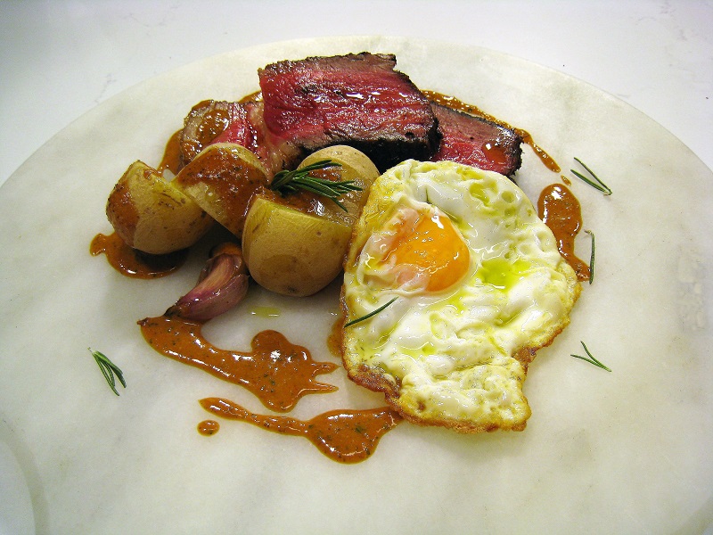 Bridar una pieza de lomo de ternera de 1,5 Kg aproximado, regarla con un poco de virgen extra, espolvorear con pimentón dulce, sal, pimienta y un poco de tomillo seco y frotar con las manos. Disponer en una bandeja de horno y asar, durante unos 35 minutos, en el horno precalentado a 200º. Para las papas “arrugás”, lavar bien 1Kg de patatas de guarnición, ponerlas en una cacerola, cubrir con agua fría, añadir ½ Kg de sal gorda, tapar y dejar cocer a fuego fuerte. Para la salsa ranchera, disponer en una jarra 1 vaso de aceite de oliva virgen extra, ½ vaso de vinagre, 2 dientes de ajo, 1 cebolleta troceada, 1 cucharada sopera de pimentón, otra de orégano, 1 cucharadita de comino, algunas hojas de perejil, 2 huevos cocidos y sal. Batir muy bien y reservar al frío. Cuando las patatas estén cocidas, escurrirlas sin destapar del todo la cacerola. Apagar el fuego y dejarlas tapadas, meneándolas cada 2-3 minutos sin destapar. Para terminar la receta de hoy, sacaremos la carne del horno y dejaremos reposar unos 5 minutos para que se asienten los jugos. Tiempo que aprovechamos para calentar un chorreón generoso de virgen extra en una sartén con 2 dientes de ajo, enteros y golpeados, y una rama de romero fresco. Cuando estén dorados los apartaremos y freiremos huevos.