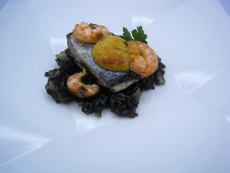 Para el caldo, comenzar a dorar, con un poco de aceite, las cabezas y caparazones de 300g de langostinos, presionando con la espátula para que suelten sabor. Cubrir con agua, añadir el verde de 1 puerro, salar y dejar hervir, a fuego suave, unos 30 minutos. Sacar los lomos a las doradas, limpias de escamas, trocearlos en porciones de tamaña medio y echar las espinas al caldo. Hacer un pequeño corte en la piel de las porciones de pescado y reservarlos al frío, cubiertos con papel húmedo para evitar que se sequen. Por otro lado, cortar ½ Kg de calamares en pequeños dados y comenzar a sofreírlos, en una paellera o cacerola, con unas cucharadas de aceite de oliva virgen extra. Picar y agregar 3 dientes de ajo, el blanco del puerro y 1pimiento verde. Incorporar 2 hojas de laurel y dejar sofreír unos minutos. Añadir a las verduras 1 vaso de arroz, rehogar brevemente y verter 3 cucharadas de tomate frito. Mezclar bien y cubrir con el triple de cantidad de caldo, previamente colado, que de arroz. Agregar unos 4 sobres de tinta de calamar, mezclar, probar de sal y dejar cocinar, unos 10 minutos, removiendo de vez en cuando. Para el alioli, disponer un diente de ajo en una jarra junto con ¼ de vaso de leche. Comenzar a batir e incorporar el doble de aceite de girasol que de leche. Terminar de darle la textura deseada con un chorreón de virgen extra. Añadir entonces una pizca de pimentón dulce, un poco de perejil fresco, unas gotas de vinagre y sal. Terminar de triturar y reservar. Para terminar el rico arroz de hoy, picar los cuerpos de los langostinos en dados , agregarlos al arroz y mezclar. Salpimentar las porciones de lubina, repartirlas por encima y pintar la superficie del arroz con varios trazos de alioli. Llevar al horno, precalentado a 230ºC, durante 5 minutos.