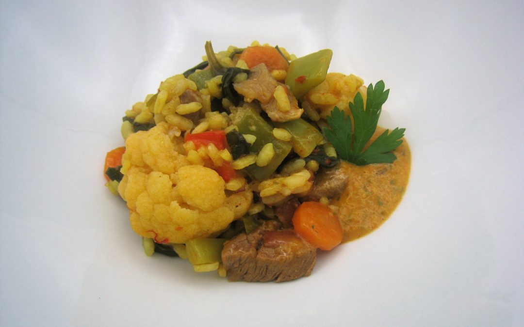 Agregar a la cacerola las habas desgranadas y 200 g de hojas limpias de espinacas. Remover bien, cocinar unos minutos e incorporar el “majao” y 1 solomillo de cerdo cortado en pequeños dados. Cubrir con 5 vasos de agua y nada más que comience a hervir, añadir 2 vasos de arroz y los tallos porcionados de una coliflor pequeña. Probar de sal y dejar hervir ,durante 15 minutos, a fuego medio-alto hasta que el arroz esté en el punto deseado de cocción.