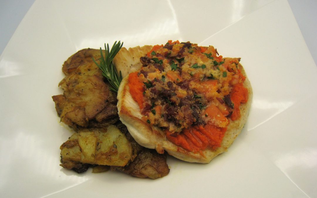 Cuando la calabaza esté tierna, escurrirla y aplastarla con un tenedor, hasta obtener un puré cremoso. Salpimentar y repartir por encima de los escalopes de pollo.