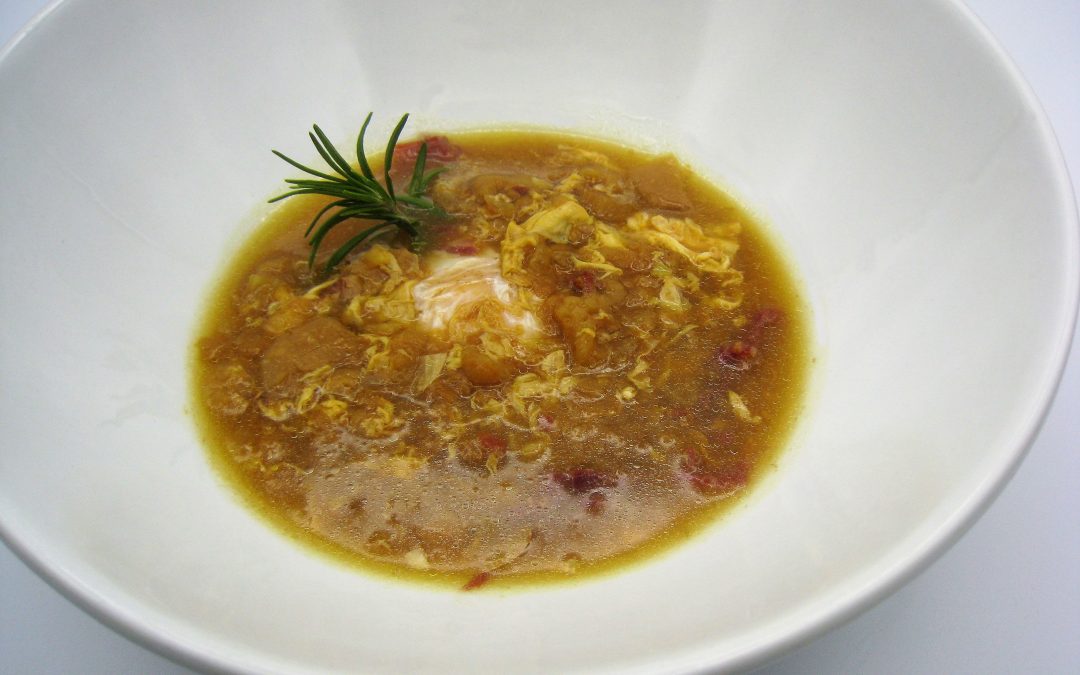 Cascar 3 huevos en un cuenco, incorporarlos a la sopa, mezclar bien, apagar el fuego y mantener caliente hasta el momento de servir.