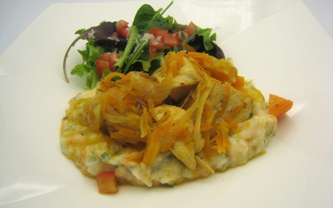 Como acompañamiento picaremos un tomate de ensalada en daditos y lo mezclaremos con un poco de lechuga y daikon rallado. Aliñar al gusto y servir junto al puré y la carne en escabeche.