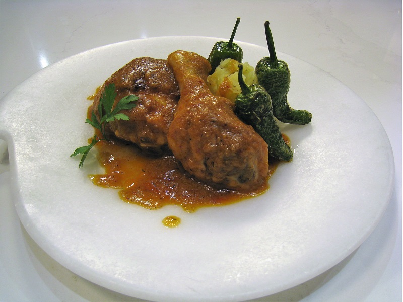 Para continuar con el pollo en salsa, apartar el sofrito de la cacerola en una jarra y añadir los pimientos choriceros hidratados, el pan frito, un pellizco de sal y 1 vaso de agua. Triturar bien y disponer de nuevo en la cacerola junto con las porciones de pollo. Cubrir con agua y dejar cocinar, a fuego medio, hasta que el pollo se cocine y la salsa espese.