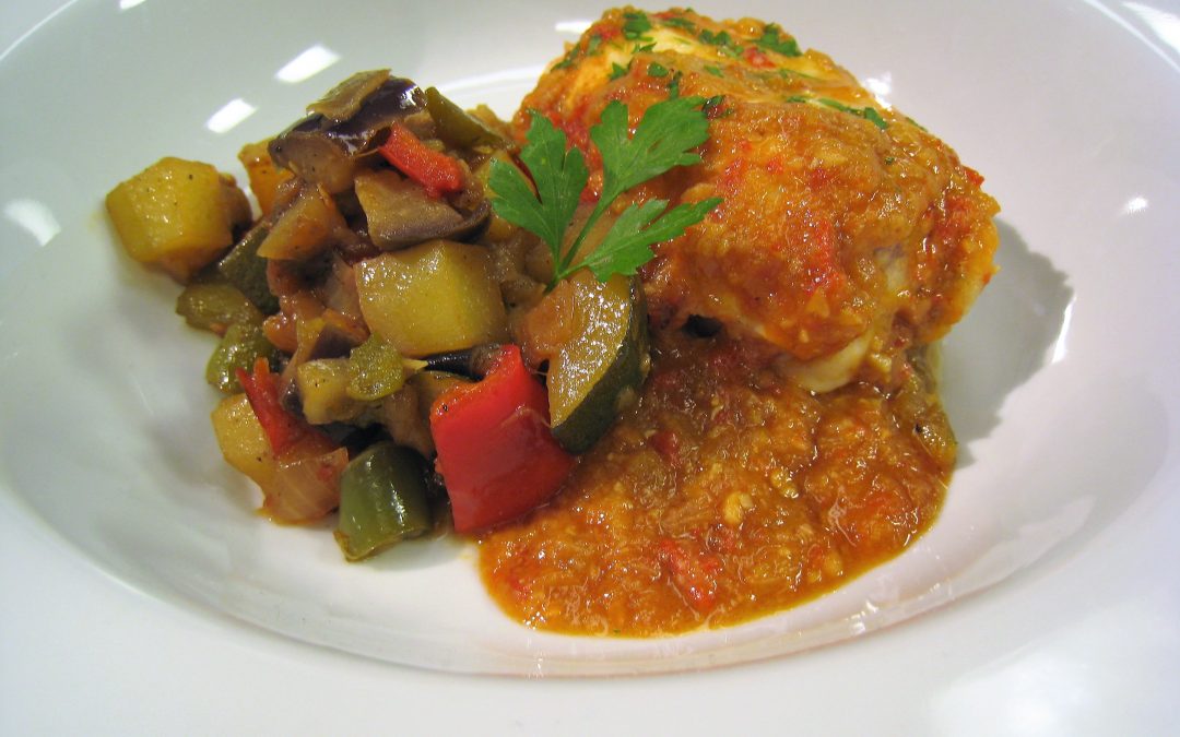 Verter 2 vasos de agua y dejar cocinar a fuego medio. Cortar en dados y comenzar a sofreír, en una cacerola con unas cucharadas de virgen extra caliente, la cebolla, los dientes de ajo, los pimientos, el calabacín, la berenjena y las patatas peladas. Salpimentar y regar con un vaso de vino blanco. Dejar cocinar, a fuego medio-alto, hasta que haya evaporado casi todo el líquido.