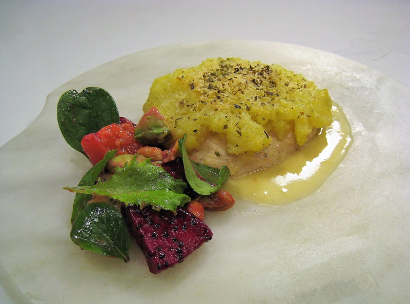 Mientras tanto, prepararemos una ensalada cortando 1 pitaya en cuartos. Pelarla, trocearla y disponerla en un cuenco. Añadir 1 tomate de ensalada y 1 aguacate picados, 50 g de cacahuetes y unos 150 g de brotes de lechuga encima. Cubrir y reservar en el frío. Pelar las patatas asadas, aplastarlas bien con un tenedor hasta hacerlas puré. Añadir un chorreón generoso de virgen extra y salpimentar.
