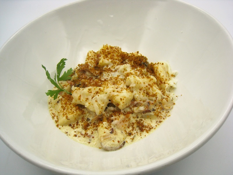 Para la salsa, picar 1 cebolla y comenzar a rehogarla con un chorro generoso de virgen extra. Incorporar 150 g de champiñones troceados y 100 g de bacón cortado en daditos. Dejar sofreír unos minutos y verter los vasos de nata. Salpimentar y dejar que reduzca.