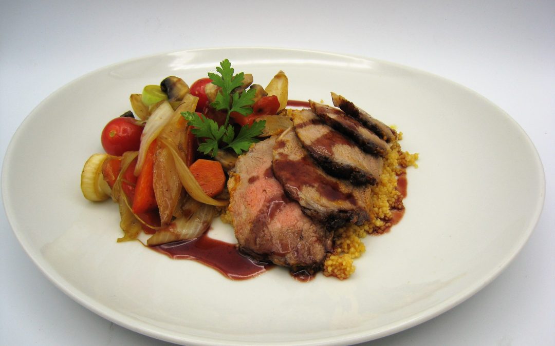 Presentar la carne sobre un poco de cuscús, con las verduras al lado y salsa por encima.