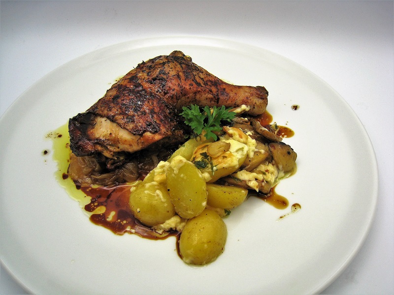 Presentar los muslos de pollo sobre la cebolla caramelizada y las patatas al ajillo al lado.