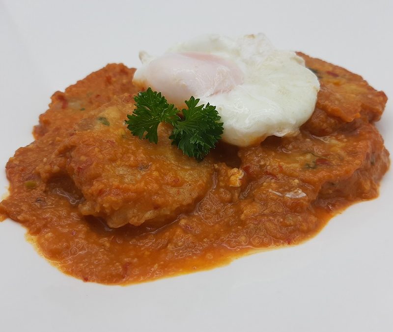 Para los huevos, poner al fuego una sartén con agua. Cuando comience a hervir, añadir un pellizco de sal y un chorrito de vinagre. Bajar la intensidad para que no hierva de forma brusca y remover con una cuchara para crear una especie de remolino y, en ese momento, cascar 1 huevo en el centro. Cocinar, durante unos 4 minutos, apartar en agua con hielo y reservar para el emplatado.