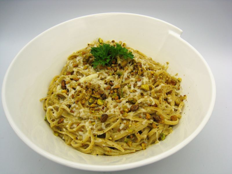 Presentar la pasta en un plato con un poco de queso rallado y los pistachos molidos reservados por encima.